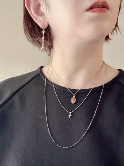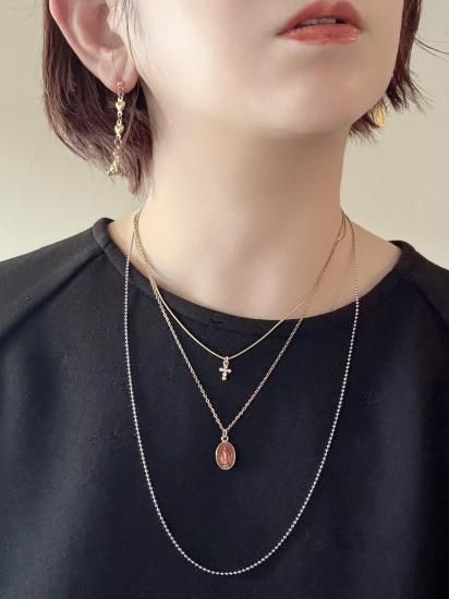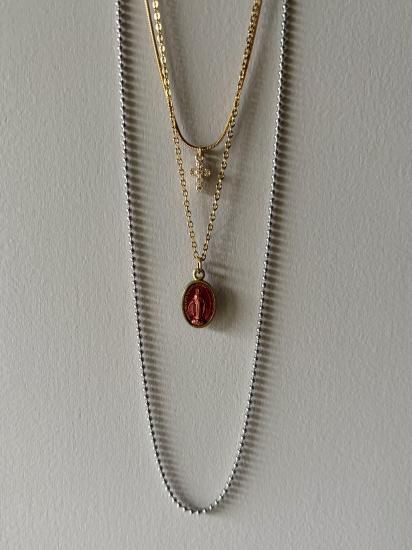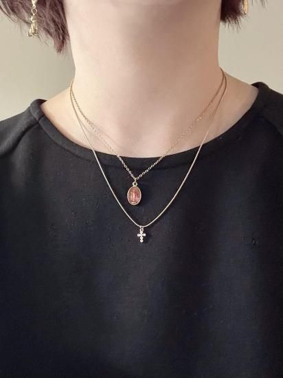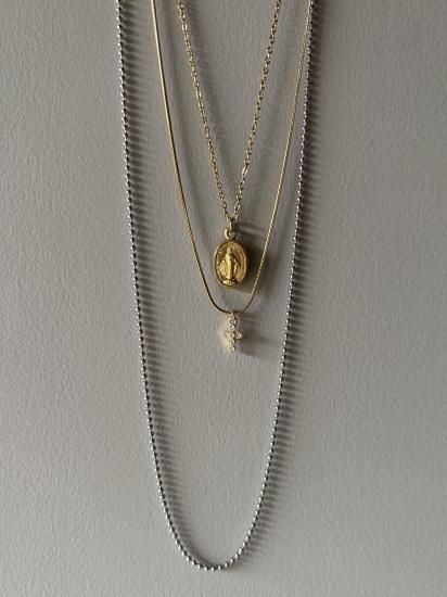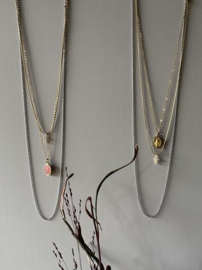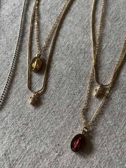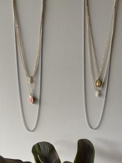 新作レイヤードネックレス 気軽に重ねて、秋冬のニュアンスを纏う。 シンプルなのに、ふと目を引く。 2本が繋がった二連ネックレスとシンプルで長めのチェーンネックレスのセットで誰でも一瞬でこなれたレイヤードが完成します。 新色のレッドブラウンとイエローゴールドのメダイユは肌にほどよく馴染む 落ち着いた秋冬カラー。 小さなビジュークロスとメダイユのチェーンは留め方次第で簡単に上下を入れ替えてアレンジも自在です。 さらに、 •シンプルチェーンだけでミニマルに、 •チャーム付き二連チェーンだけで主役級に、 •2つを重ねてぐっと洗練された印象に。 気分に合わせて使える3way以上の楽しさが魅力。 シンプルチェーンは華奢なボールチェーンネックレス。お手持ちのネックレスとのレイヤードスタイルも楽しめます。 チェーンは ゴールド × シルバーのコンビカラー。 どんな服にも自然となじんで、こなれ感のあるおしゃれ上級者見えを叶えます。 季節の装いに、少しだけ冒険と、少しの遊び心を。 気軽に重ねられる新しい定番レイヤードです。 |