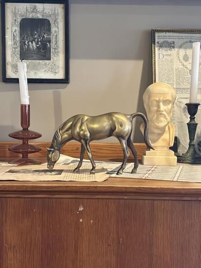 凛とした立ち姿、滑らかな筋肉の陰影、首を垂れて草を食む穏やかなフォルムはまるで1つの静かな芸術品のよう。 この馬の姿を見たとき、学生時代の夏の記憶がよみがえりました。 研修旅行で引退後の名馬・オグリキャップに会いに行ったあの日。 バスの窓越しにのびのびと草を食むオグリの姿を見た瞬間、「ああ、幸せに過ごしているんだ」と心からホッとしたあの感覚。 馬の持つ静かな品格と優しさがこのオブジェにも重なりました。 今話題のドラマ「ロイヤルファミリー」に登場するような北海道日高の自然豊かなファームでゆったりと寛ぐホープを連想させるクラシカルなブロンズカラーが空間に気品を添えてくれます。 経年による変色・キズ・汚れあり。 古いものですので写真と状態をよくご確認の上、ご購入ください。 ○特記していなくても経年による劣化・傷・汚れなどある場合があります。 ○写真と実物は多少異なる場合があります。 ○不明点などあればお気軽にメールにてお問合せください。 素材:真鍮 国:不明 サイズ:23cm(尾を含む)×H13cm |